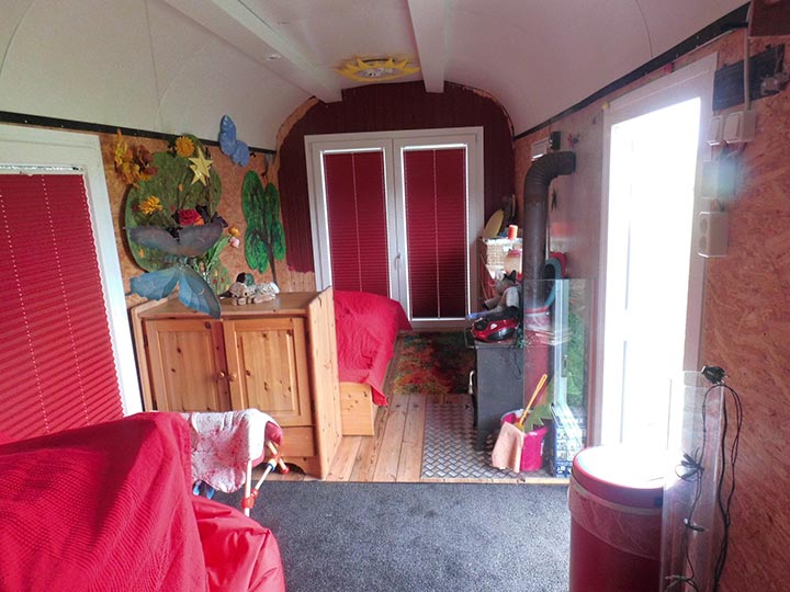 Wir haben zwei unterschiedliche Zirkuswagen für uns. Den großen Wagen für Erwachsene und das eigene kleine Reich für bis zu vier Kinder. Beide Wagen stehen direkt nebeneinander, sodass wir schnell bei den Kindern sind.